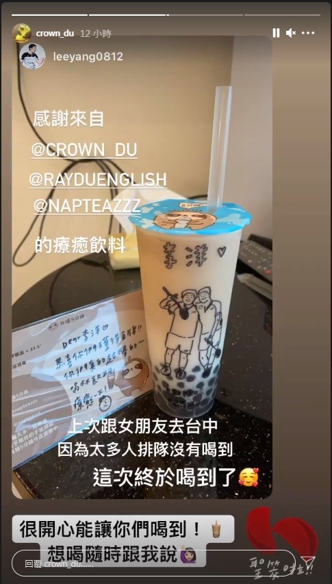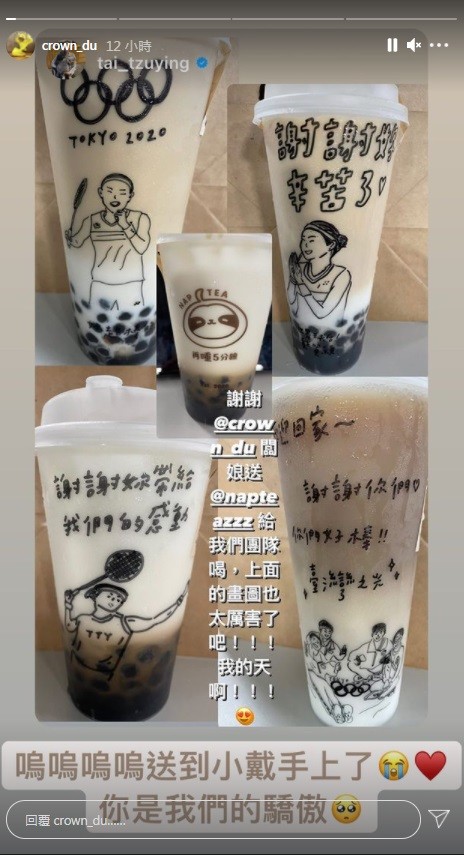 ▼滴妹隨後分享戴資穎的限時動態,表示杯身上的圖案是自家品牌經理親自手繪的,還霸氣承諾自家手搖飲都讓戴資穎免費喝:「來來來每天要來幾杯都沒問題,你最可愛,你是最厲害的!」