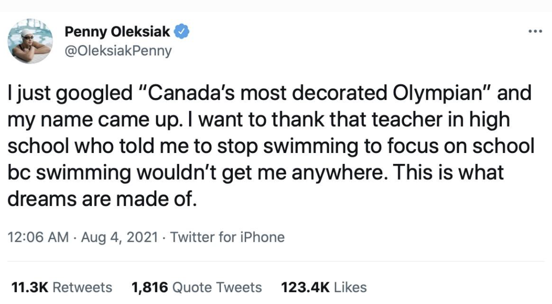2021年08月09日在本屆東京奧運中,21歲的加拿大泳將奧萊西亞克(Penny Oleksiak)游出好成績,總共拿到1銀2銅共3面獎牌。賽後她在推特上向高中老師「道謝」,寫道:「謝謝你當初說我游泳沒前途,但我的現在正是夢想打造的。」