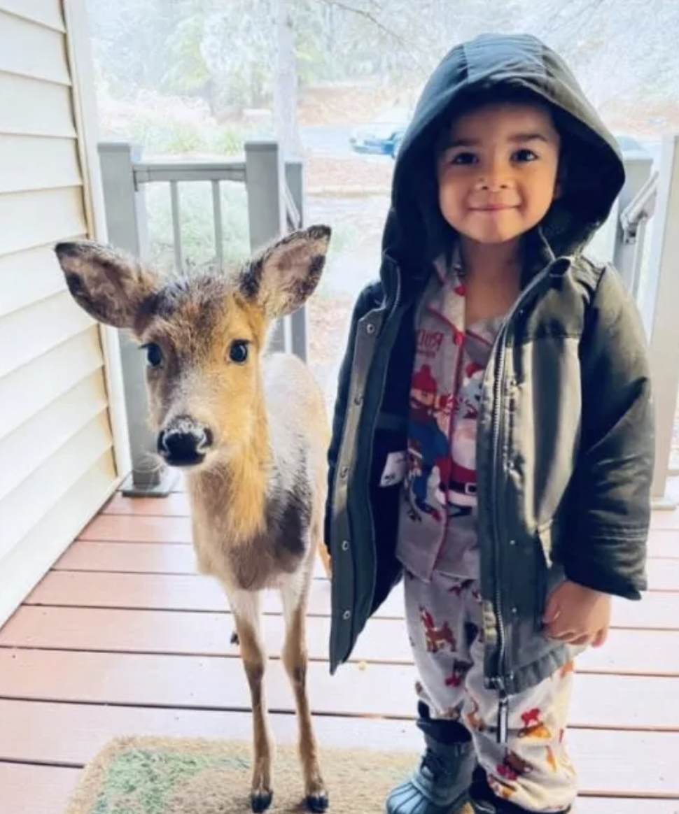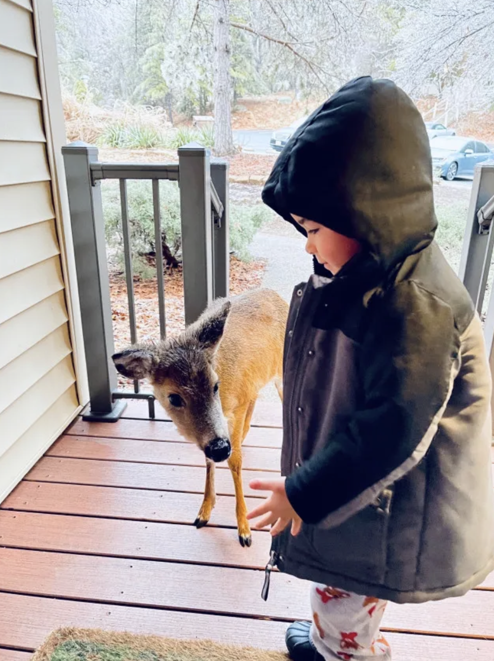 ▼Stephanie一家再度假村玩的那幾天,小鹿一直跟在兒子身邊。她將兒子和小鹿的合照po上網,開心說:「我開門時看到兒子和小鹿站在一起,牠的眼神好純淨,讓人感覺很溫暖。」