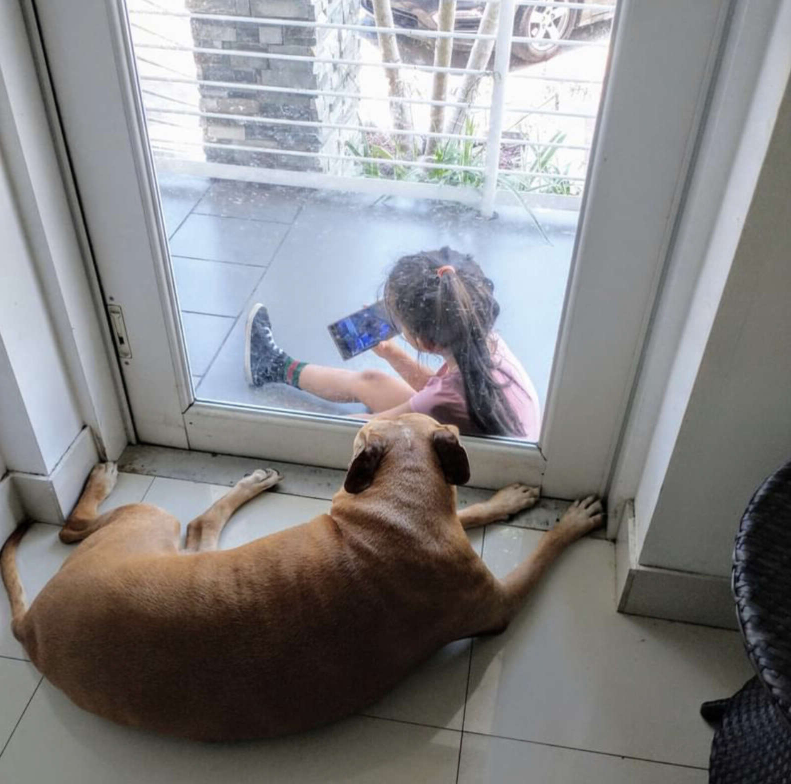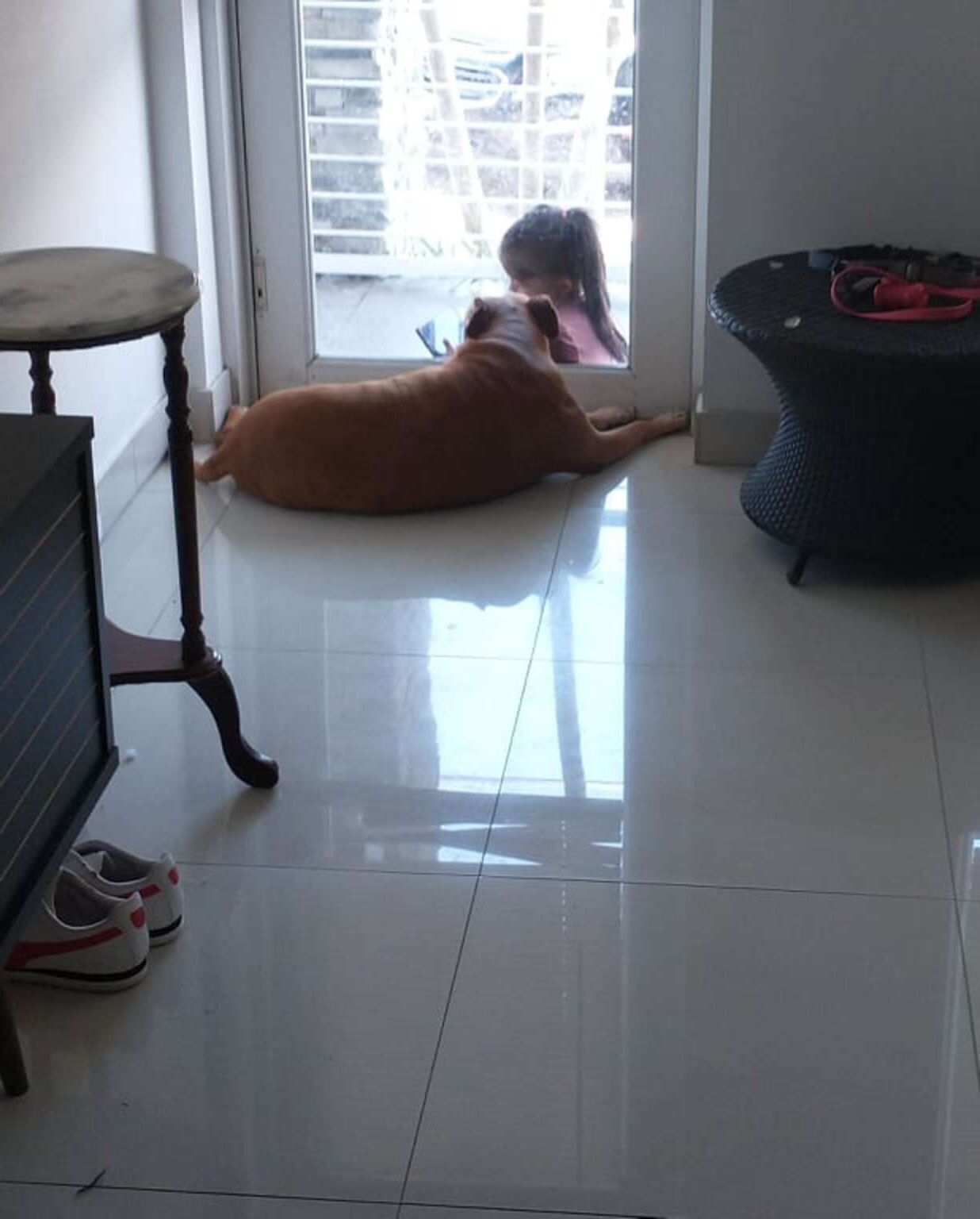 ▼Sheitan個性溫和,很容易交到朋友。有一天Bridget在家裡工作時,看到了非常有愛的一幕。只見Sheitan躺在客廳門口,正和一個陌生的小女孩互動。女孩拿著手機,跟Sheitan跟著玻璃聊天。