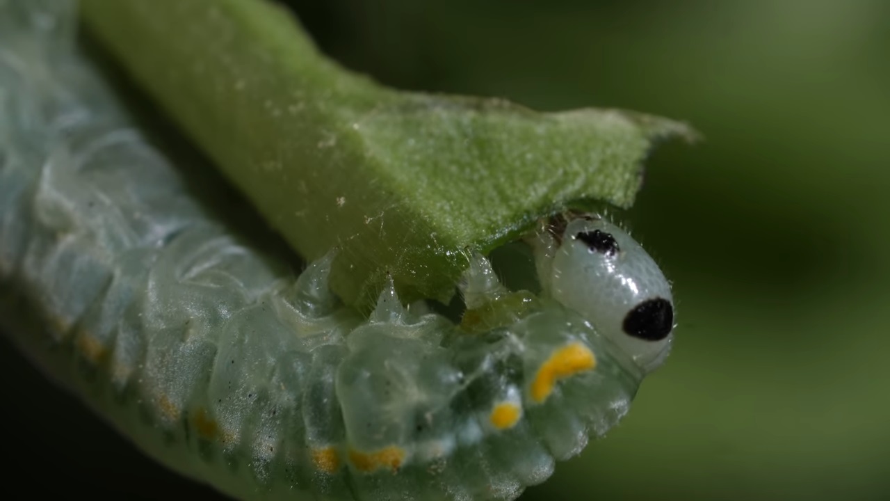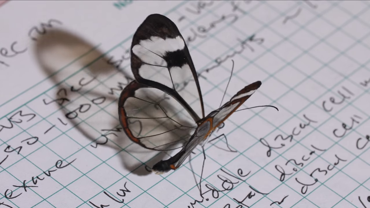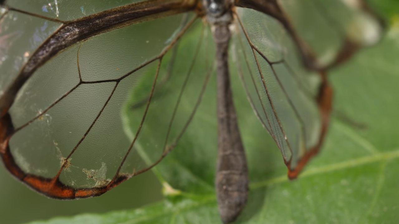 ▼玻璃翼蝴蝶從幼蟲時期開始體內就因為缺乏色素而呈現半透明狀態,等它們長大變成蝴蝶後,原本構成毛毛蟲身體外殼的透明甲殼素就成了透明翅膀的材料來源。