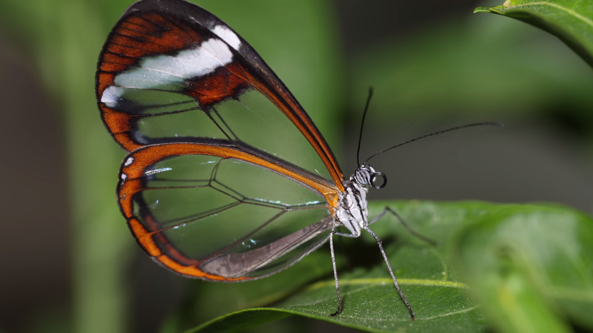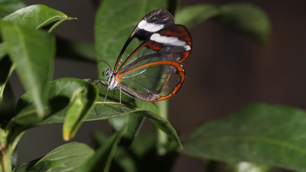 ▼玻璃翼蝴蝶的學名是Greta oto,它們的翅膀雖然有黑、白、橘色的外框,但是中間的部分看起來就像是用一層透明的玻璃紙填滿一樣透明無色,而且幾乎不會反光,也因此能夠在雨林中躲過掠食者的搜捕。