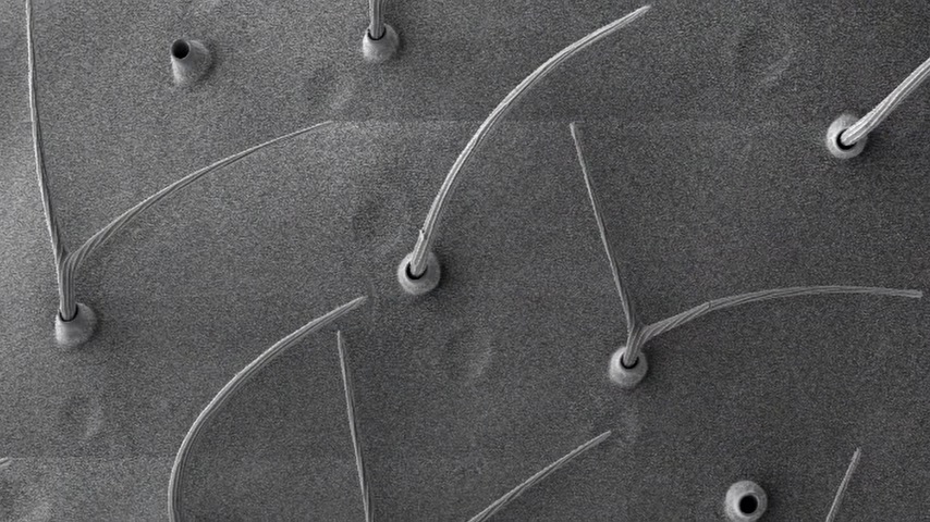▼如果拿顯微鏡進一步放大翅膀的透明部分,就會發現薄如蟬翼的透明組織上其實遍布著絨毛和粗糙的網狀紋理。