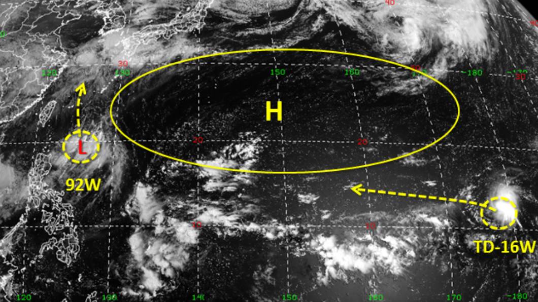 除此之外,目前台灣東南方的擾動92W沒有明顯發展的條件,但正沿著高壓邊緣北上,將通過台灣以東向北併入鋒面內。雖然它對台灣沒有直接影響,但可能讓午後雷雨發展更旺盛。而遠在換日線附近的TD-16W有可能進一步發展成今年第12號颱風「奧麥斯」,路線大致是沿著高壓邊緣往西移動,未來的移動路徑值得持續觀察~