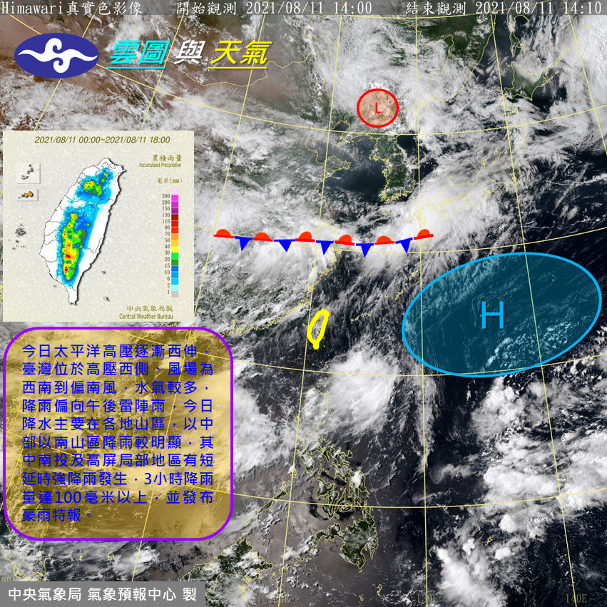 ▼吳聖宇指出,影響台灣將近3個禮拜的季風低壓帶終於在這兩天逐漸向北遠離台灣附近,久違的太平洋高壓勢力向西伸展,雖然勢力還是不夠強,不過已經讓台灣的天氣型態轉變為午後雷雨為主的情況。預估一直到週末都會維持這種午後雷雨的天氣,局部地方的瞬間雨勢偏大,午後外出應多留意天氣變化的情況。