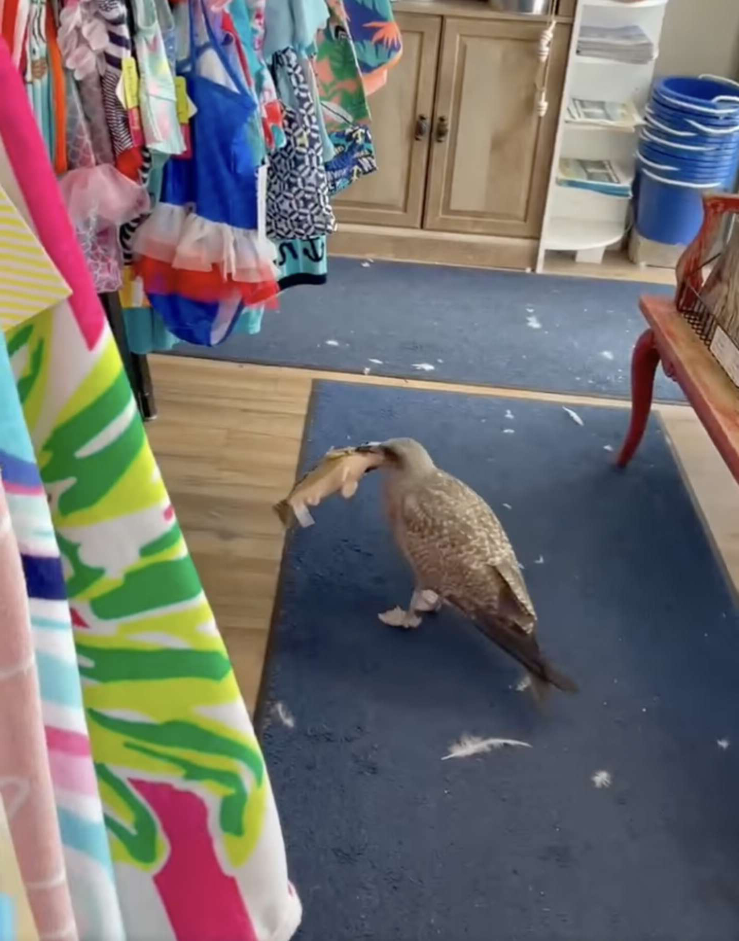 ▼小海鷗沒有放棄,牠一直在等待機會。Kylie說:「店裡的顧客都注意到牠了,有人問我『牠應該在這裡嗎?』我知道他們是在說這隻小海鷗,就將牠趕出去。但牠堅持要那個玩具魚,第4次進來終於成功偷走了。」