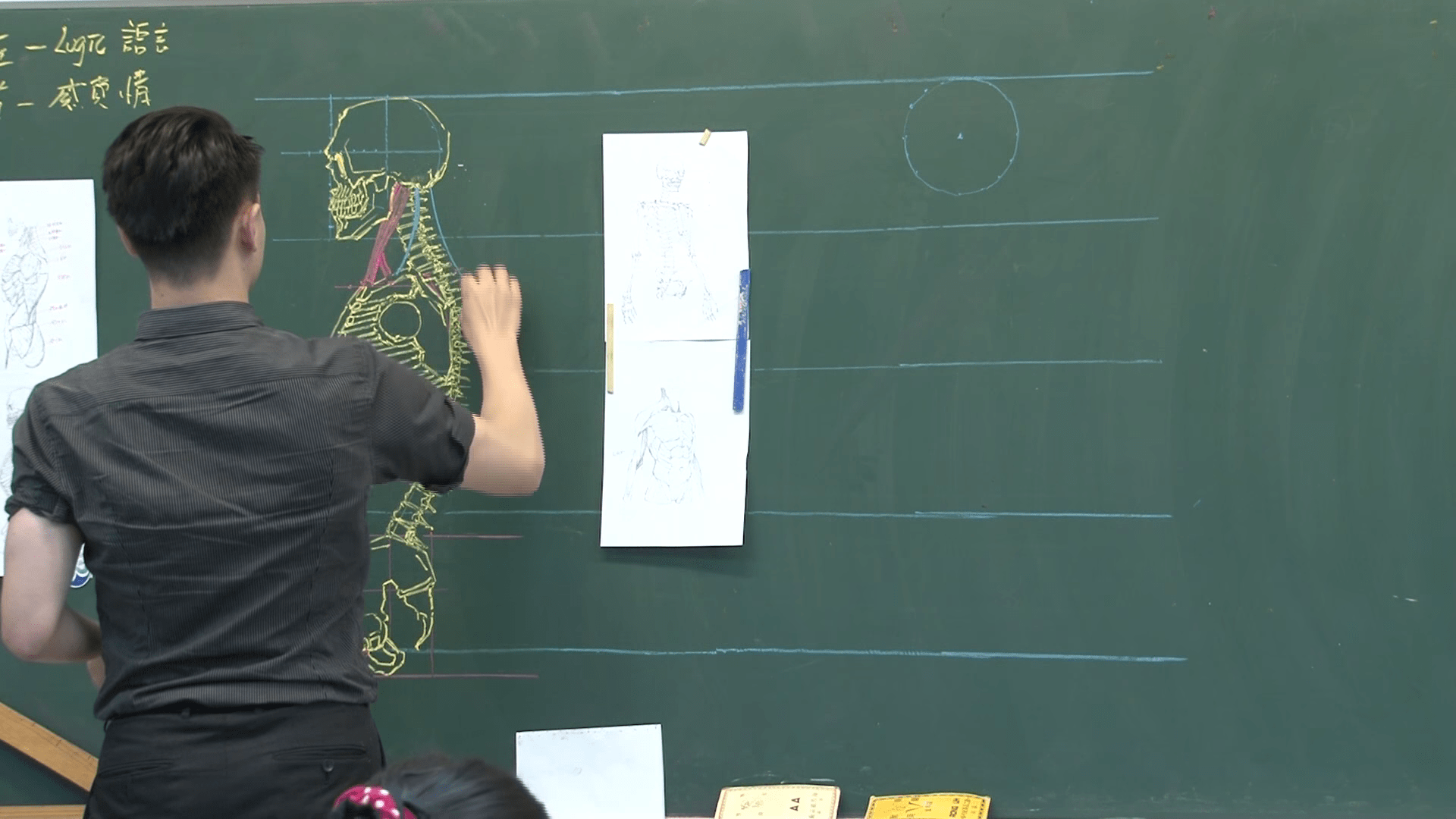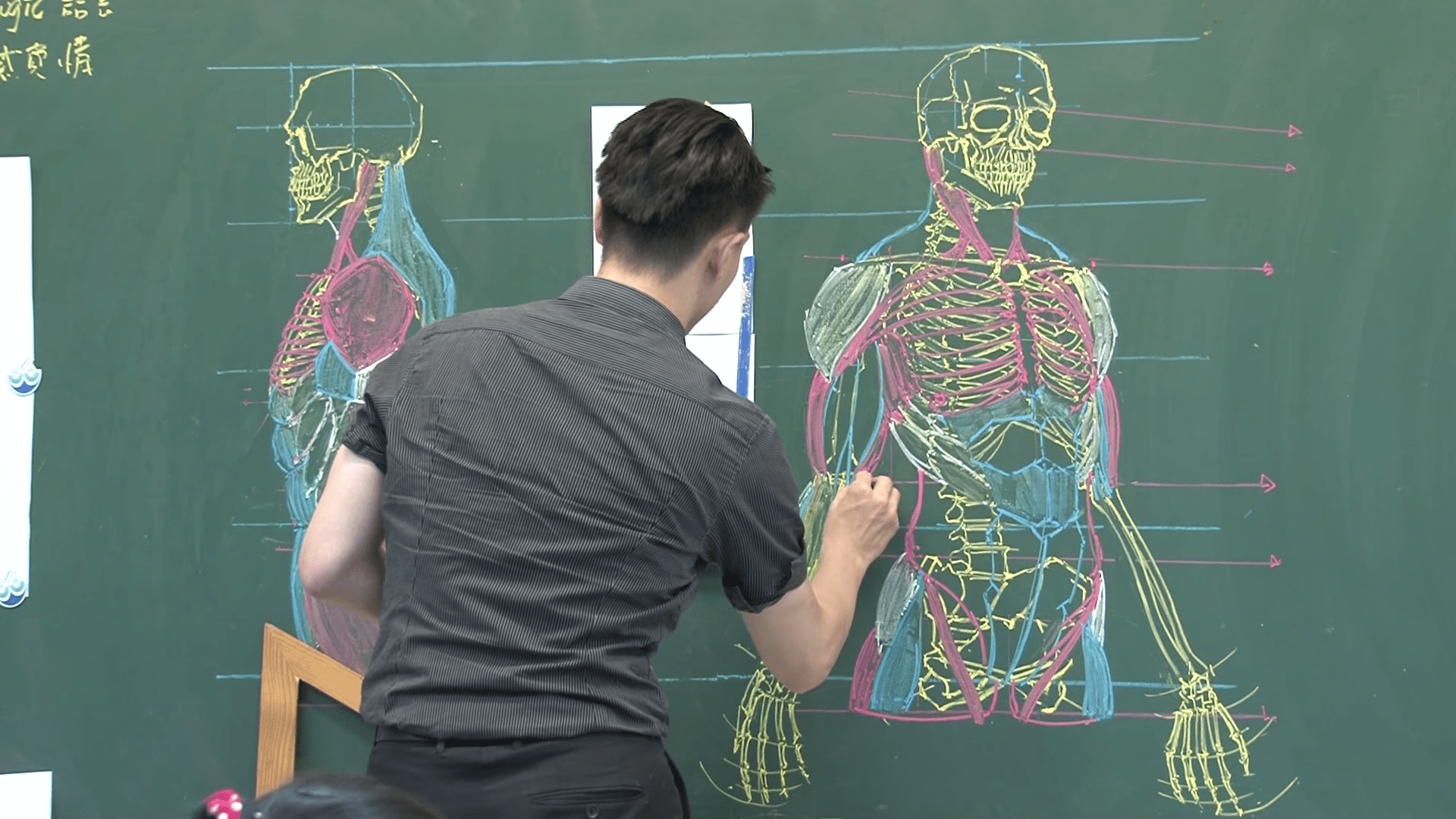 ▼在鍾全斌的課堂上,常可以看到他以輔助線,清楚解釋人體結構與肌理,徒手畫出教科書等級的人體解剖圖。精美的畫作讓人一目了然,很快就可以理解人體各部位的相對位置。