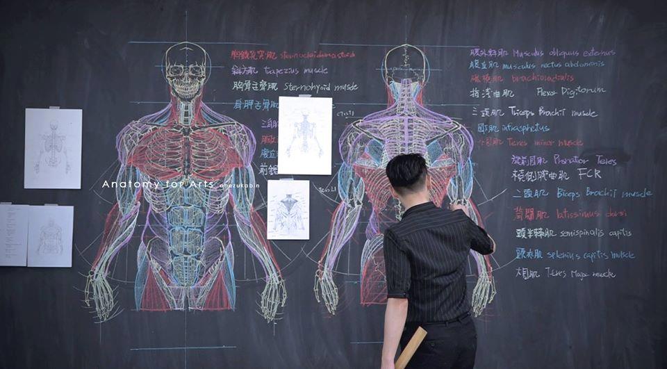 ▼鍾全斌不只傳授設計課,他精準的構圖也受到醫學院青睞。原本和醫學沒有交集的他,因為在手繪骨骼圖在網上傳播,應聘為廈門醫學院老師,特別傳授醫學生繪製「人體形態素描」,解構骨骼、肌肉和內臟的位置。