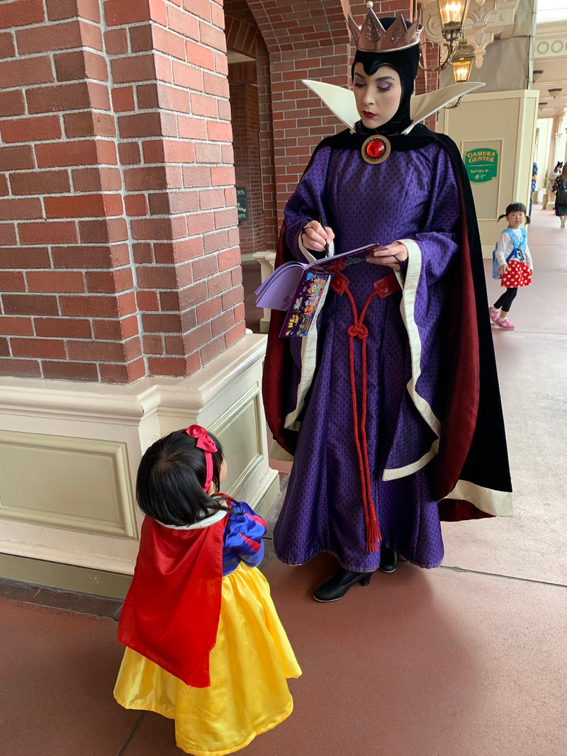 ▼雖然壞皇后臉超臭,但還是心不甘情不願地替小女孩簽名了。她大概也覺得迷你白雪公主很可愛,根本無法抵抗她的魅力吧。