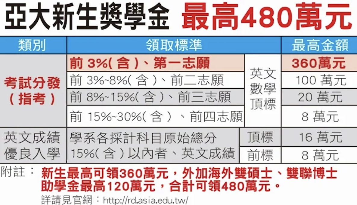 亞大主任秘書施能義表示,指考採計科目在全國前3%,且數學、英文成績原始分數均達頂標以上,且第一志願選讀亞大的學生,最高可領取360萬元入學獎學金,外加海外雙聯碩、博士助學金最高120萬元,合計可領480萬元獎學金。