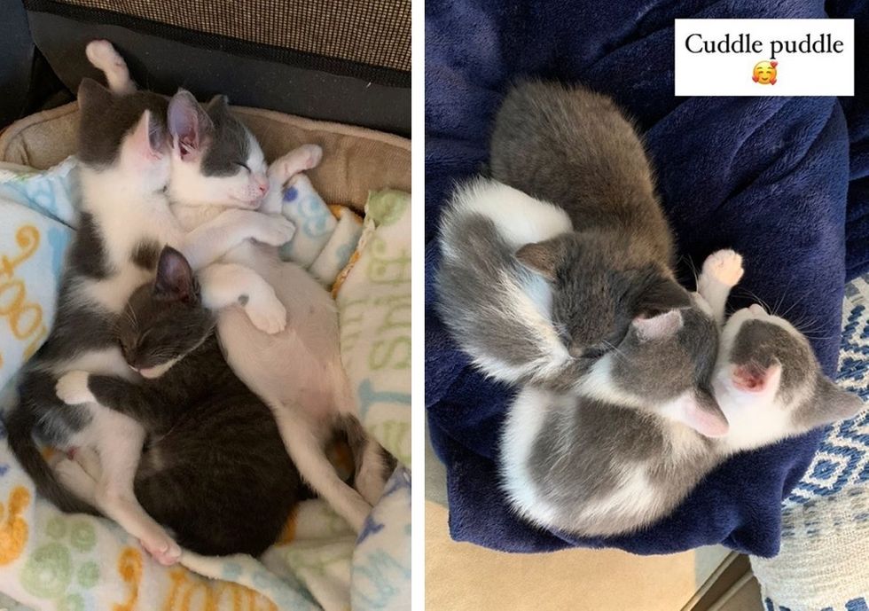 ▼Jules第一次跟雙胞胎貓咪見面就成為了好朋友,牠們互相舔毛,還一起玩耍、窩在一起睡覺,就像認識了好久一樣。