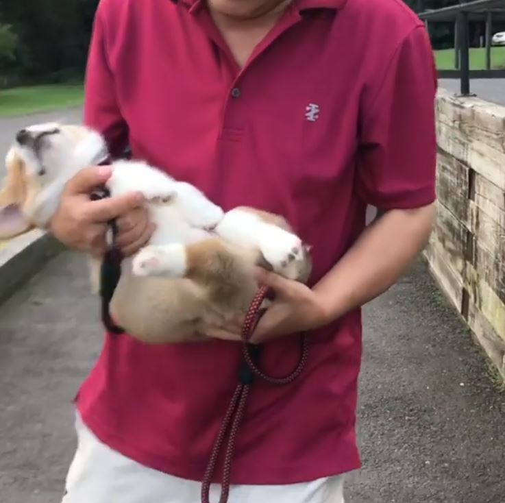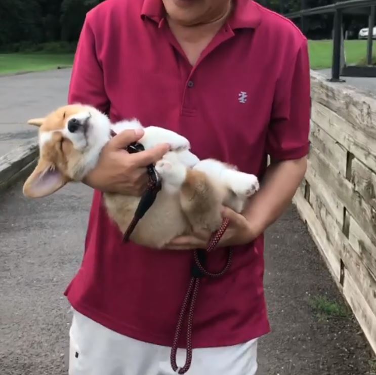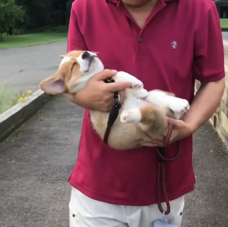 倫家走不動惹~ 柯基散步到一半「睡成一坨麻糬」 主人溫柔公主抱:這孩子太懶啦♥