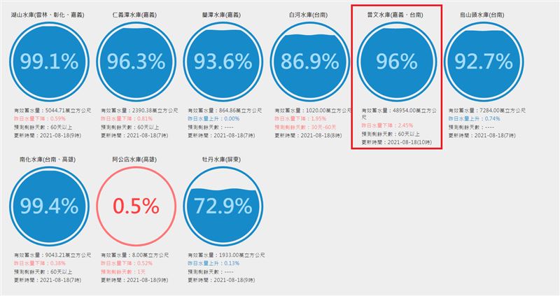 除此之外,南投的日月潭水庫蓄水量為11630.98萬噸,蓄水率90.8%;曾文水庫有效蓄水量50652萬噸,蓄水率99.4%。從本月2日開始,曾文水庫進行調節性放水,這是近2年來該水庫首度洩洪,同時進行水庫下游河道淤泥暫置場的沖淤作業。全台水庫都滿滿的,終於可以放下憂慮,但節約用水是好習慣,還是要繼續保持呦~