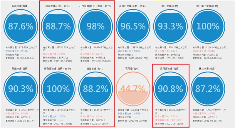 ▼根據經濟部水利署水庫水情顯示,截至18日早上10點,位於新北的翡翠水庫有效蓄水量為29780.60萬噸,蓄水率為88.7%;石門水庫的有效蓄水量為19874.87萬噸,蓄水率98%;台中德基水庫有效蓄水量為16444.67萬噸,蓄水率88.2%。