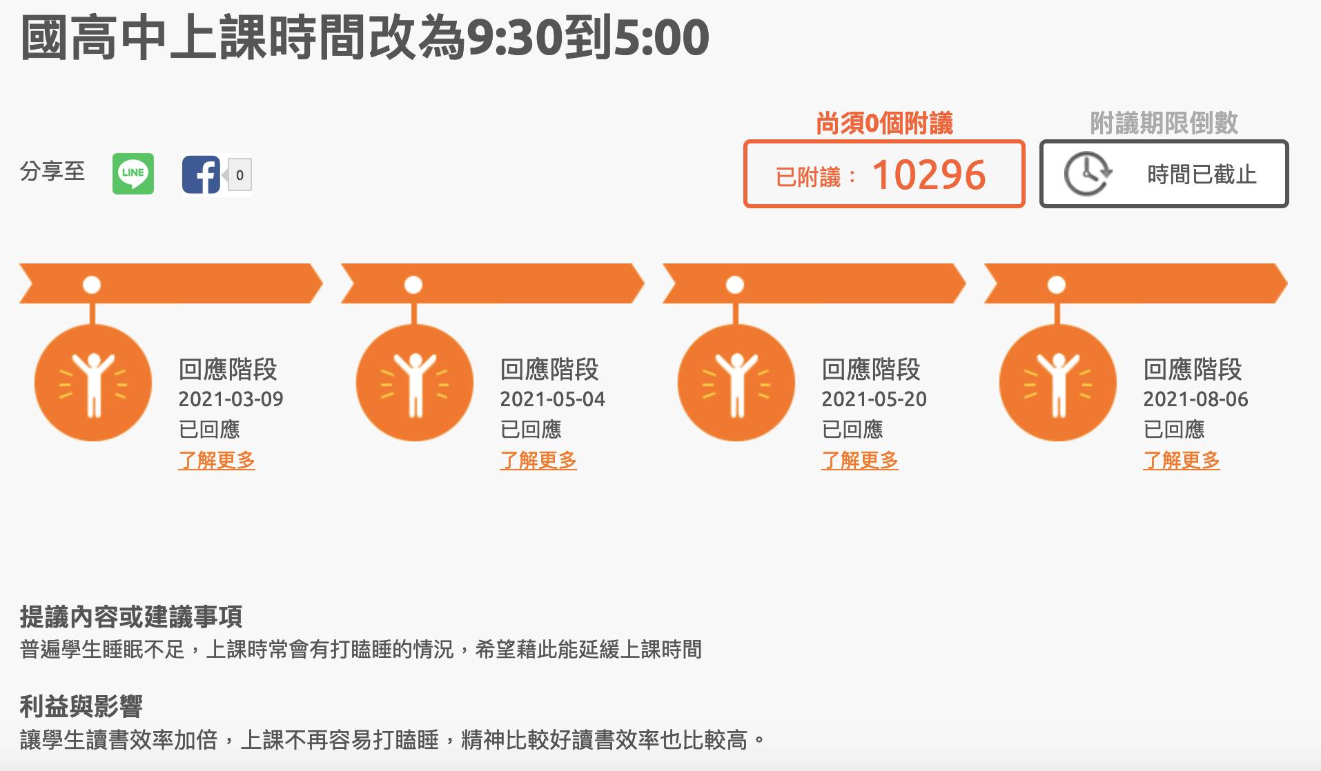 教育部舉辦的線上公聽會在8月19日、24日舉行,每場次邀請100位民眾進行參加。對於「國高中上課時間改為9:30到5:00」這項提案,台灣青年民主協會串聯民間團體、學生團體發起線上調查,針對是否支持「延後上學時間」和「高中早自習法規落實情形」2個面向進行意見蒐集。