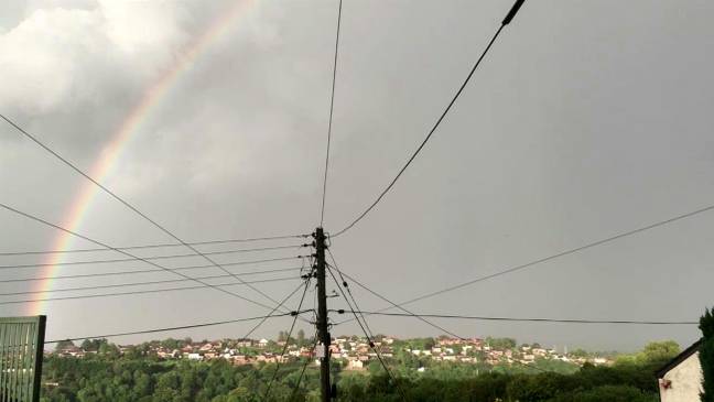 ▼Steven表示,風雨來臨時他正在花園中上私人教練課,期間他聽到了奇怪的嗡鳴聲。下課後他拿起手機,準備拍照看看,沒想到隨手拍到了閃電穿過天空,沿著彩虹劈下的畫面。他也驚訝地寫下「這簡直是百萬分之一的機率,我一直都希望能拍下這種罕見的異象,這次真的被我捕捉到了」。