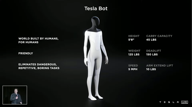 ▼從馬斯克展示的簡報來看,「Tesla Bot」的外型就像一般人形,只是臉上多了一塊大螢幕,來顯示資訊。機器人的身高為172公分、重65公斤,每小時的最高速度為8公里。機器人的身高、體重設計都是有講究的,這一數值是為了降低人們對機器人的恐懼,讓人們面對機器人時不只是可以逃跑,還能擊倒他。