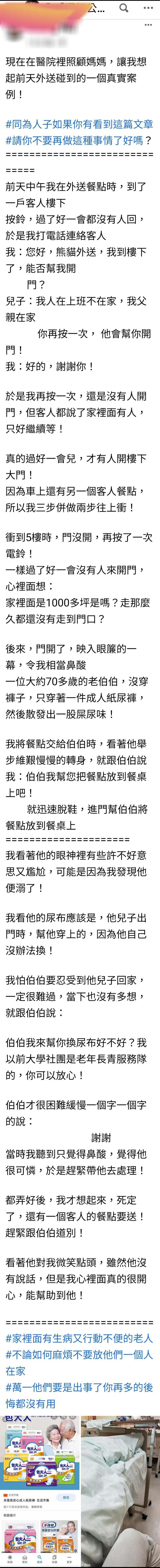 2021年08月21日台灣越來越邁向高齡化社會,年長者的照料議題也關係到許多人。一位網友在臉書社團分享自己親身遇到的經歷,工作是外送員的他表示,前幾天外送餐點時,應門的是位年約70多歲的老伯伯,更令人窘迫的是老伯伯身上僅穿了件成人紙尿褲,還散發出屎尿味,此情景令他頓時感到十分鼻酸。