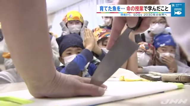 ▼魚被養大後,經過全班表決,多數派認為應該好好把魚吃掉,以示「對食材的尊重」,然而老師的做法卻讓許多人看了非常不舒服!課堂上,孩子們戴著頭巾和口罩,看著老師用刀把自己的寵物魚切成薄片,老師甚至要求孩子自己動手。