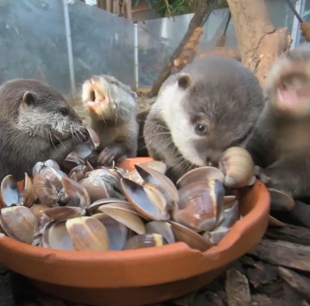 ▼這些水獺每一隻都胖乎乎的,顯然生活得非常好。但牠們面對美食,還是忍不住爭先恐後大吃特吃。牠們看到一整盤蛤蜊,小手不停往盆內摸索,抓到後就雙手捧著吃掉,那貪吃的模樣非常可愛,就像乖寶寶一樣。