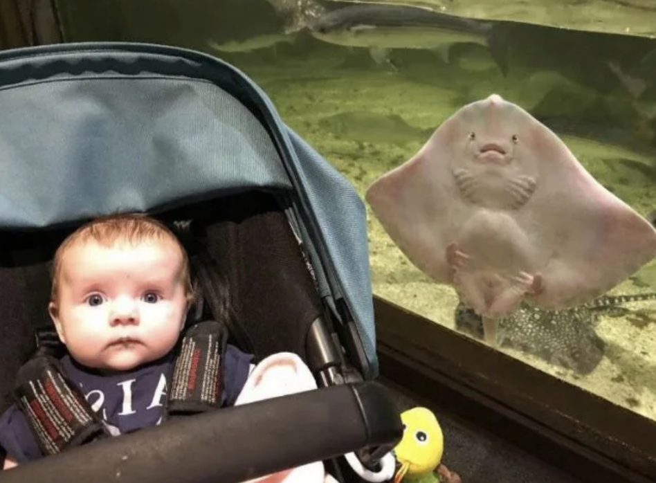 ▼那隻魟魚對坐在嬰兒車裡的Daisy特別感興趣,一直跟在她的身邊。Wendy突然注意到,女兒和魟魚的表情竟然是一樣的!她連忙將這一幕拍下來,笑說:「這是我們最喜歡的照片之一。我拿出手機,想給孩子拍一張照片,正好看到Daisy和魟魚露出同樣的表情。我忍不住哈哈大笑,連忙紀錄下這一瞬間。」