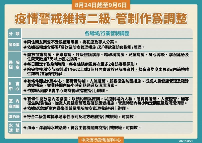 2021年08月23日鑒於雙北仍有零星感染案例,指揮中心於21日宣布,二級警戒再度延長至9月6日。同時宣布多項鬆綁措施,其中包括從8月24日起,同住親友可以在餐廳免隔板共餐,無需梅花座、專人分菜。