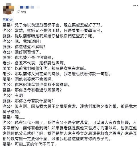 ▼婆婆立刻表示,自己的女兒不會煮飯,而媳婦會煮飯,當然不一樣。她又問:「你煮飯的時候,岳母都沒有說什麼嗎?」剛好妻子的哥哥也是負責煮飯的那一個,老公就回:「大舅子比我還會煮,年夜飯都他包辦的。」「現在年代不同了,如果娶老婆要她來當奴才,誰敢嫁給我們,她不會留在家照顧自己的父母就好了嗎,我們對人家又沒有養育之恩或是救命之恩。」「家務是互相的,沒有誰一定要負責做什麼,以後我也會這樣教育你的孫子。」