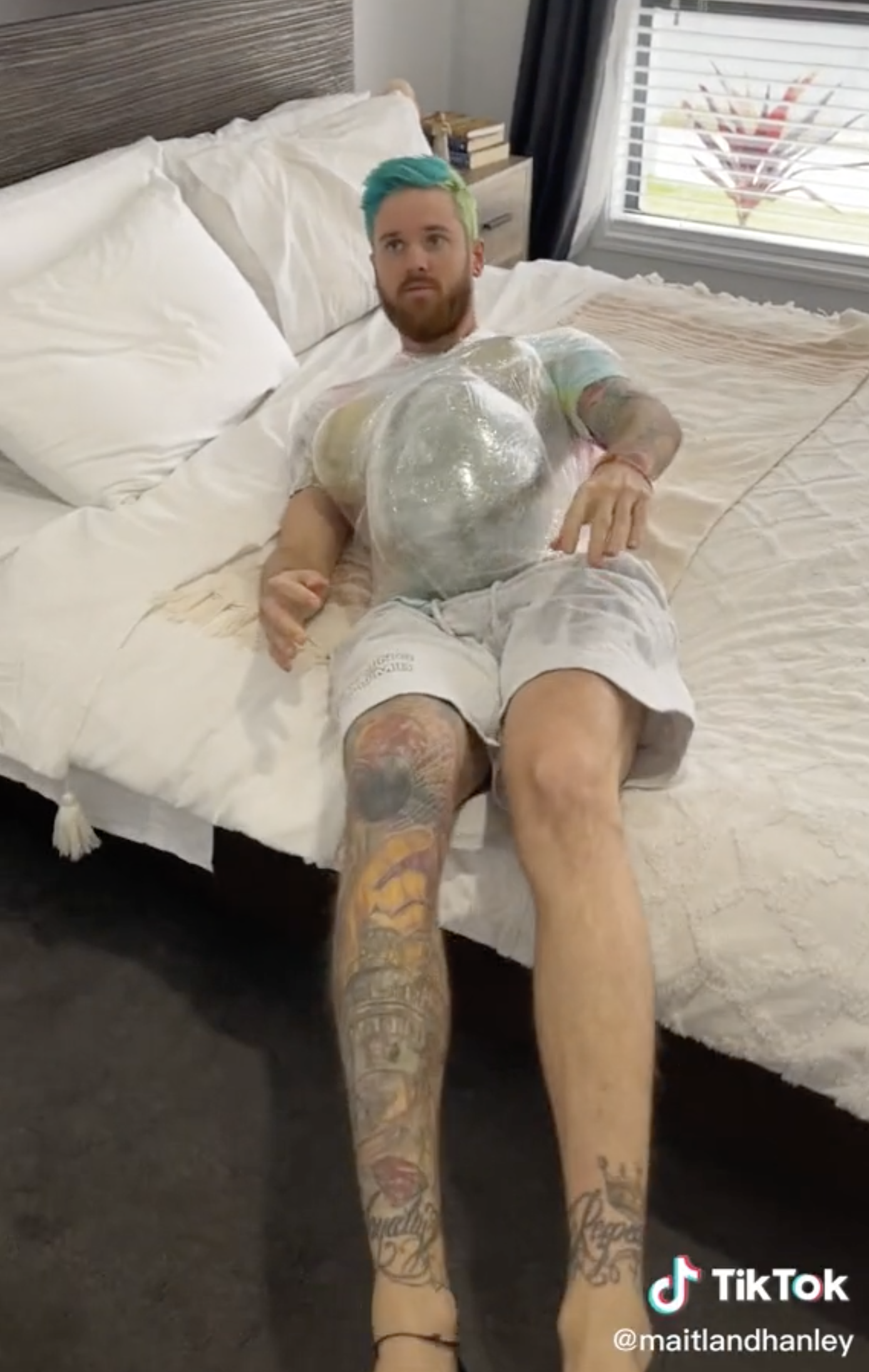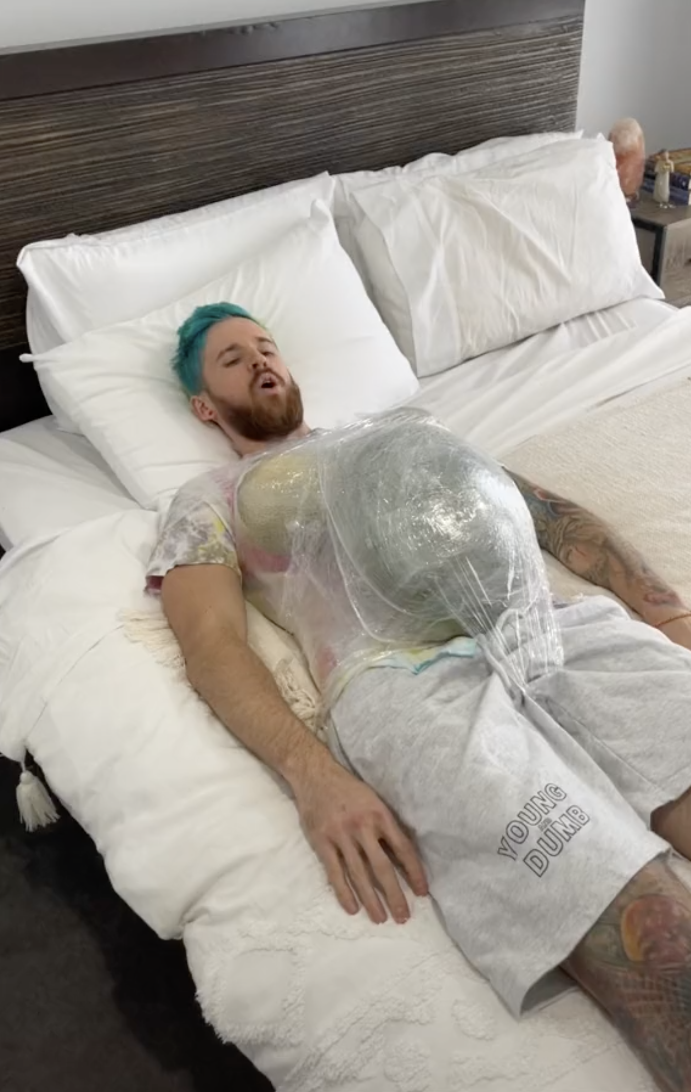 ▼Maitland非常好奇孕婦的日常,他用保鮮膜包著2顆小西瓜、1顆大西瓜,固定在胸前和腹部,模擬女生懷孕時的模樣。影片一開始,他帶著3顆西瓜起床,沒想到一個簡單的翻身起床動作,都做得非常困難。
