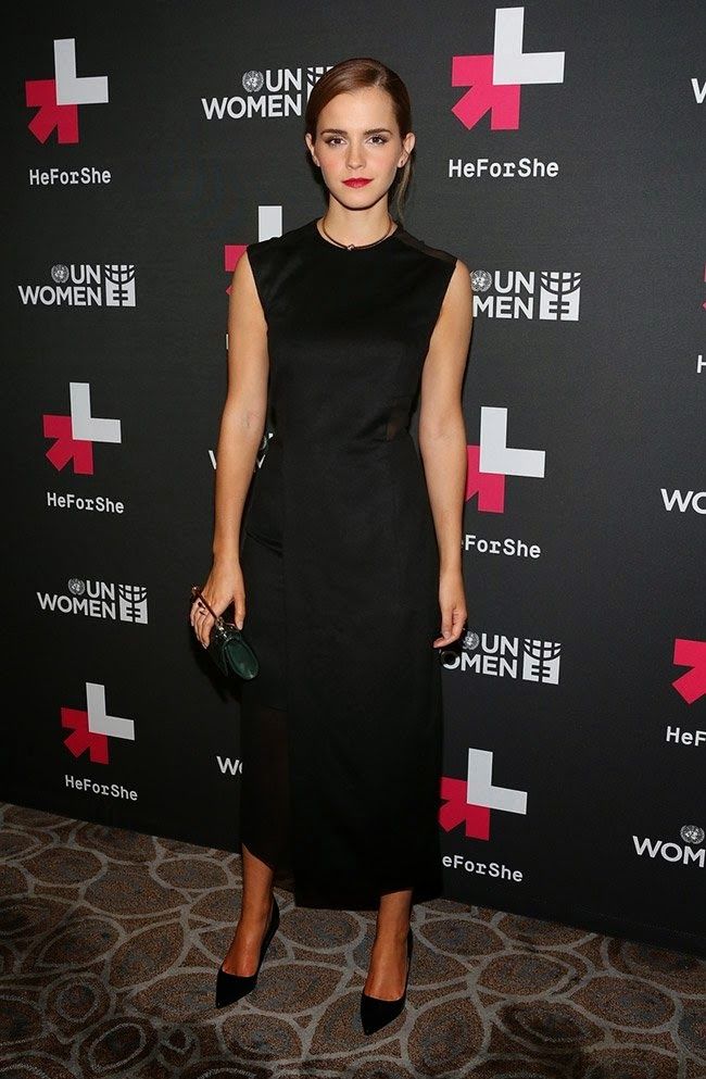 ▼演說完畢之後,艾瑪華森又現身晚宴之中。這次她換上Hugo Boss的黑色長洋裝,整體看上去充滿知性美,姿態非常優雅。