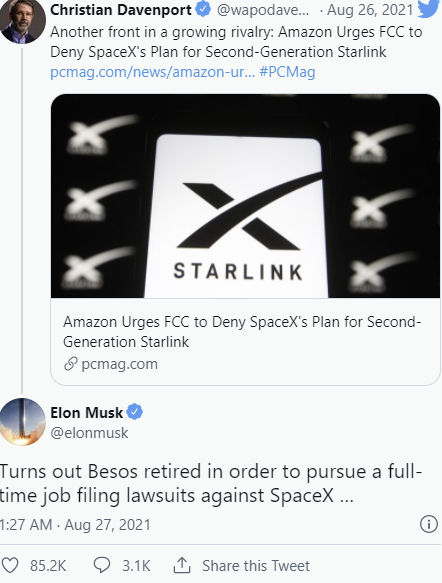 對此馬斯克在推特上諷刺說:「原來貝佐斯(Jeff Bezos)退休是為了全職對SpaceX提起訴訟。」SpaceX和亞馬遜在太空事業上的競爭越來越激烈了~