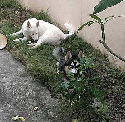 ▼其中白色的狗狗比較膽小,低下頭不敢看鏟屎官;另一隻狗狗就不一樣了,牠竟然躲到一棵植物後面,希望能夠躲避鏟屎官犀利的目光。