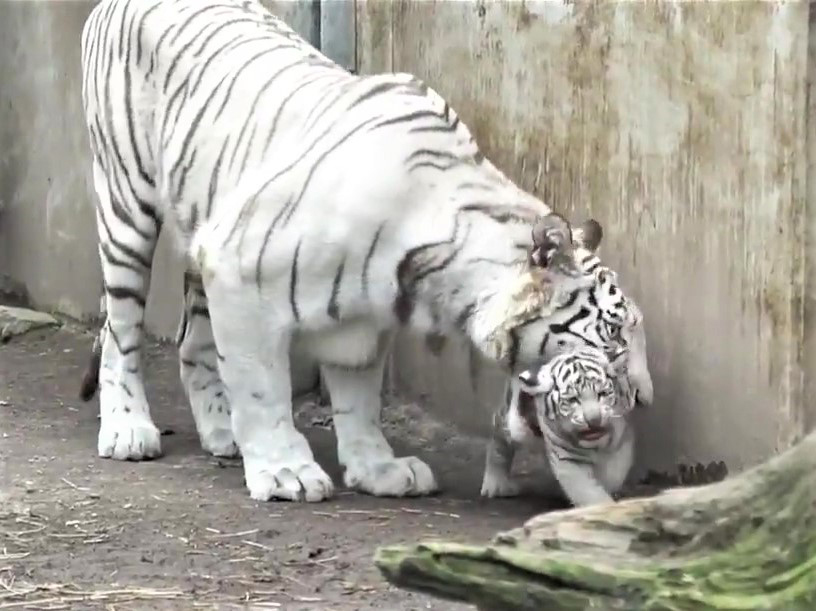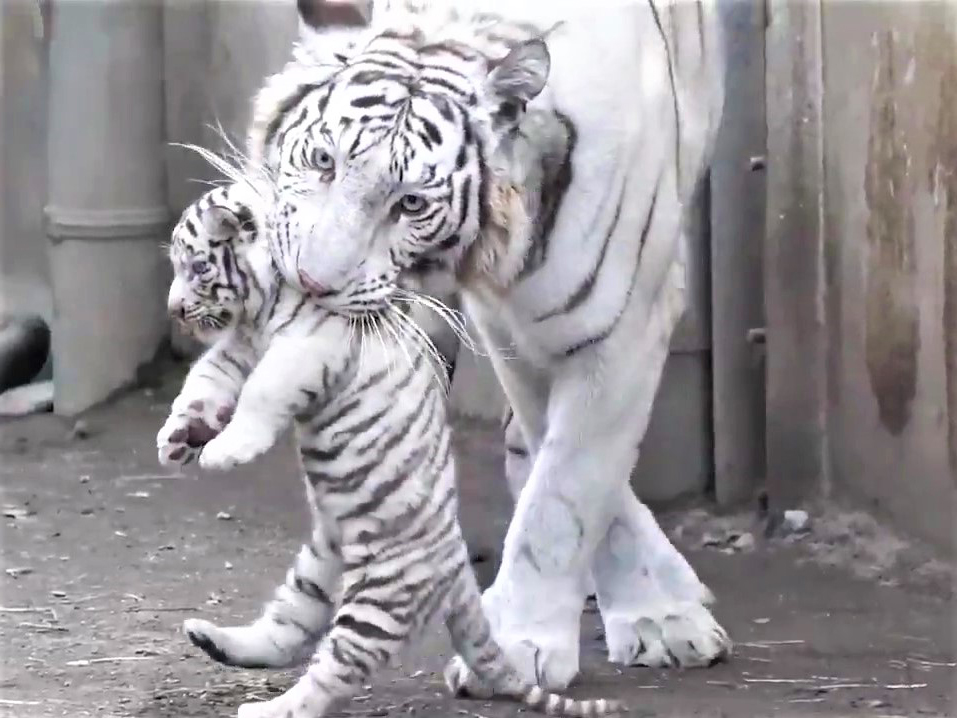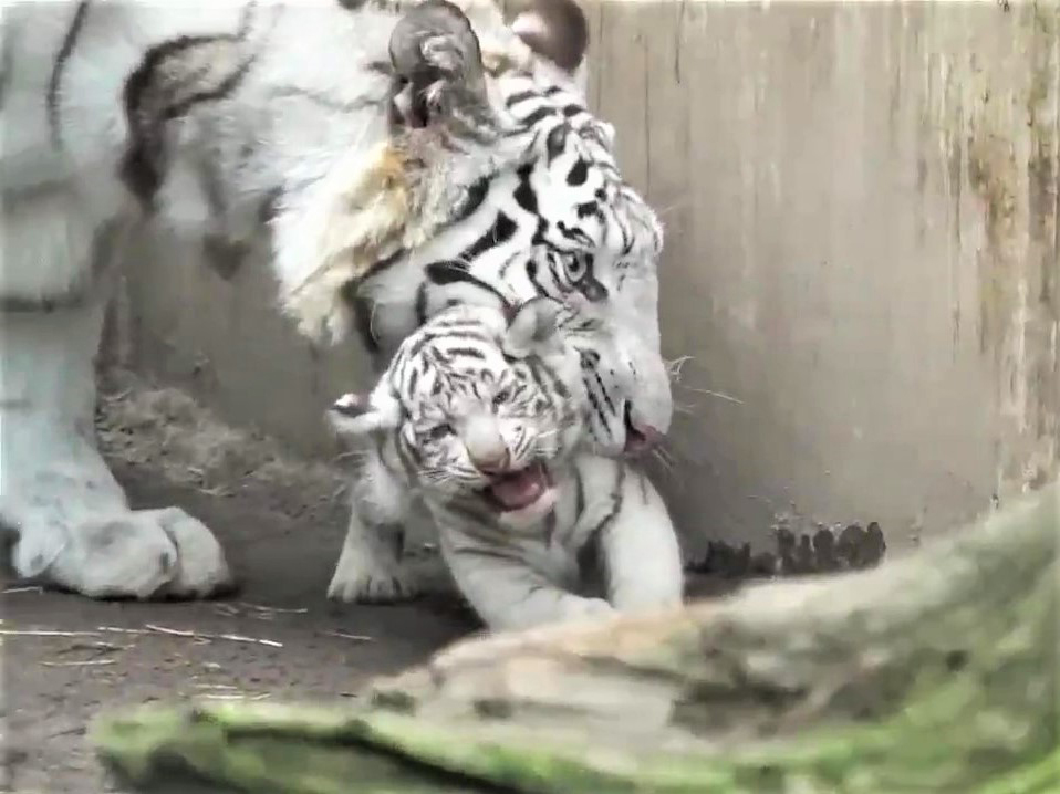 偶不要回企!小白虎「反抗虎媽」堅持還想玩 被叼起後頸卻「突然軟掉」:是一顆白麻糬~