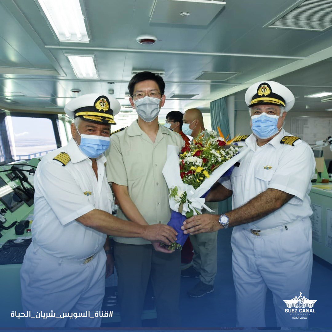 ▼長範號通過時,蘇伊士運河管理局局長雷比(Osama Rabie)指示2名引水人登船,給船長獻花。船長和引水人特別交換紀念品,並拍照紀錄世界最大的長範號首次通過運河的珍貴時刻。