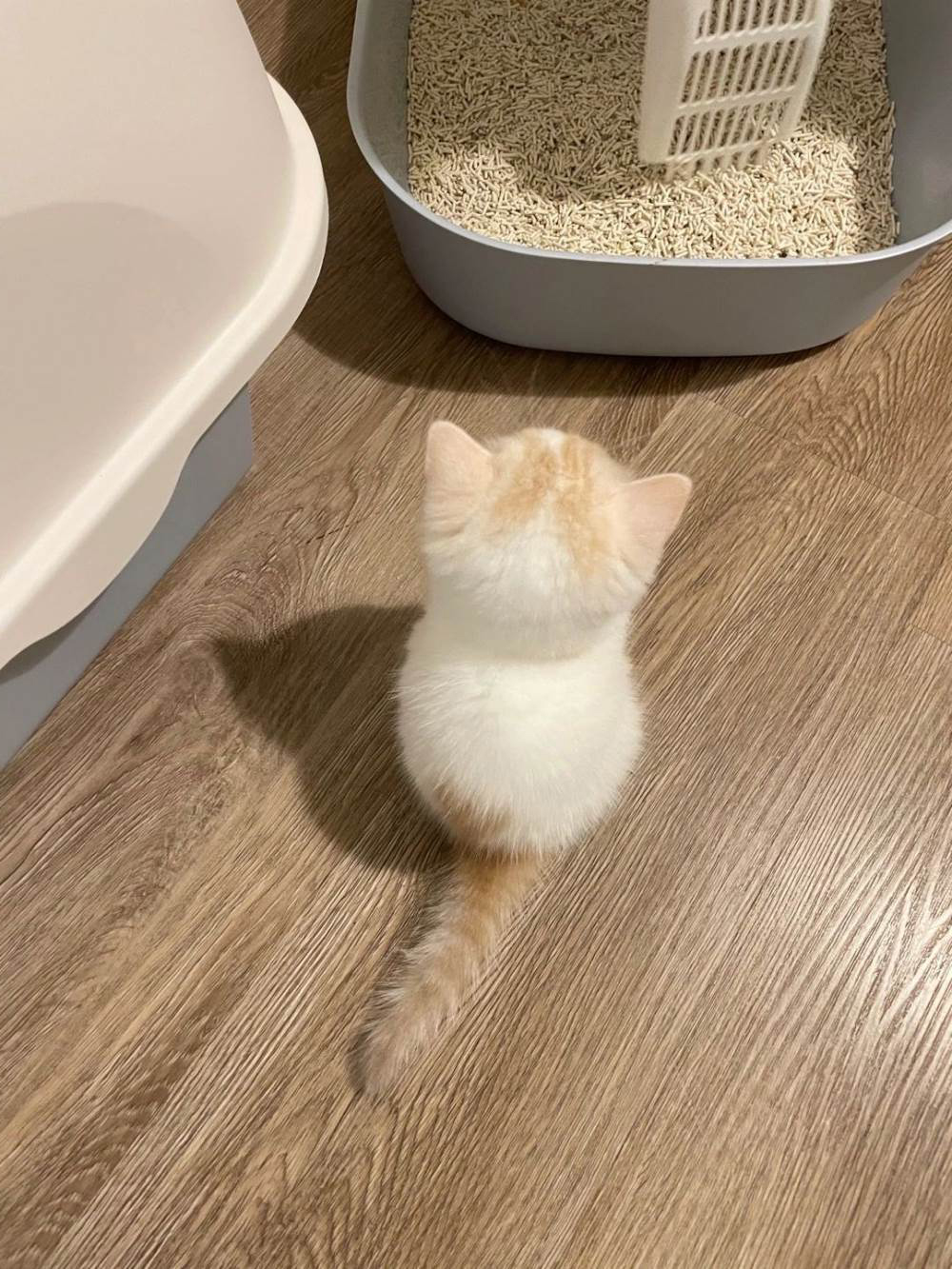 ▼貓咪小小的耳朵搭配圓潤的身材,是不是很像小雪球?只看牠的背影,就能猜到牠的表情有多認真。牠是教官嗎?坐在旁邊一臉嚴肅監督鏟屎官清理貓砂盆,是要檢查有沒有清乾淨?