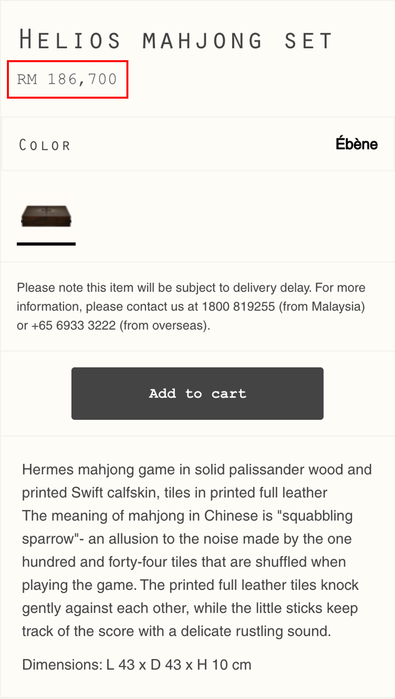 ▼馬來西亞Hermès的官網上也有這款麻將牌,價格為RM186,700(約110萬6千台幣)。